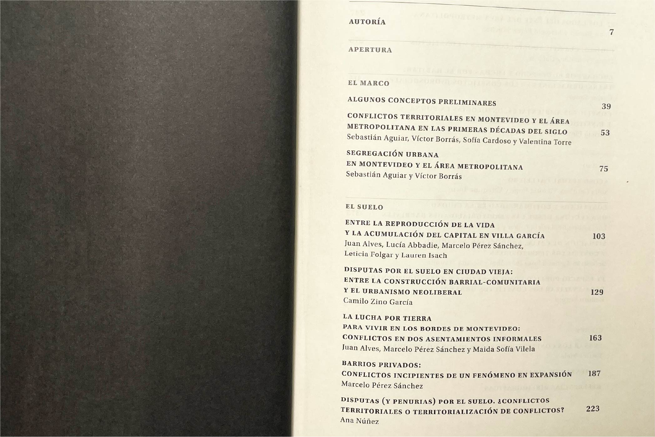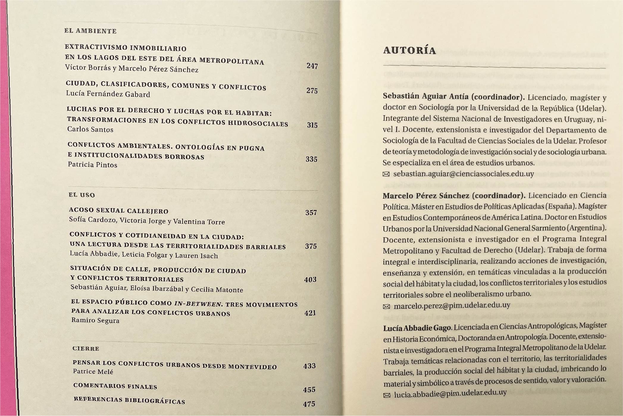 Este trabajo ofrece un panorama de los conflictos ambientales, por la propiedad del suelo y por el uso del espacio público en Montevideo y el Área Metropolitana durante lo que va de este siglo. Incluye además diez estudios de caso sobre situaciones vigentes, junto con aportes de especialistas de Argentina y Francia. Los textos proponen reflexiones y aprendizajes que contribuyen a debates centrales: los efectos de los conflictos, el neoliberalismo urbano, las dinámicas de amortiguación, las desigualdades y opresiones, y las disputas por la justicia espacial.